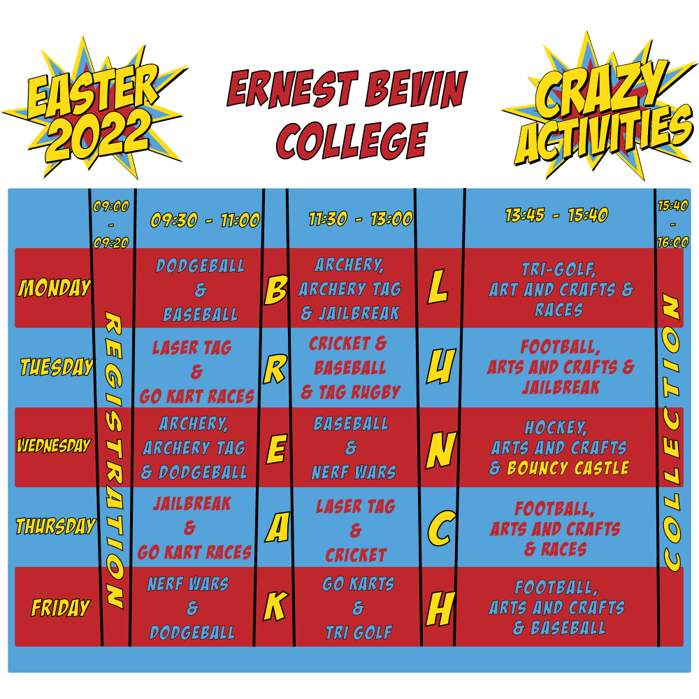 Crazy Camps Club (Year 1 to Year 7 groups): Drop off is between 09:00 and 09:20 and collection between 15:40 and 16:00. No pets on the premises please.