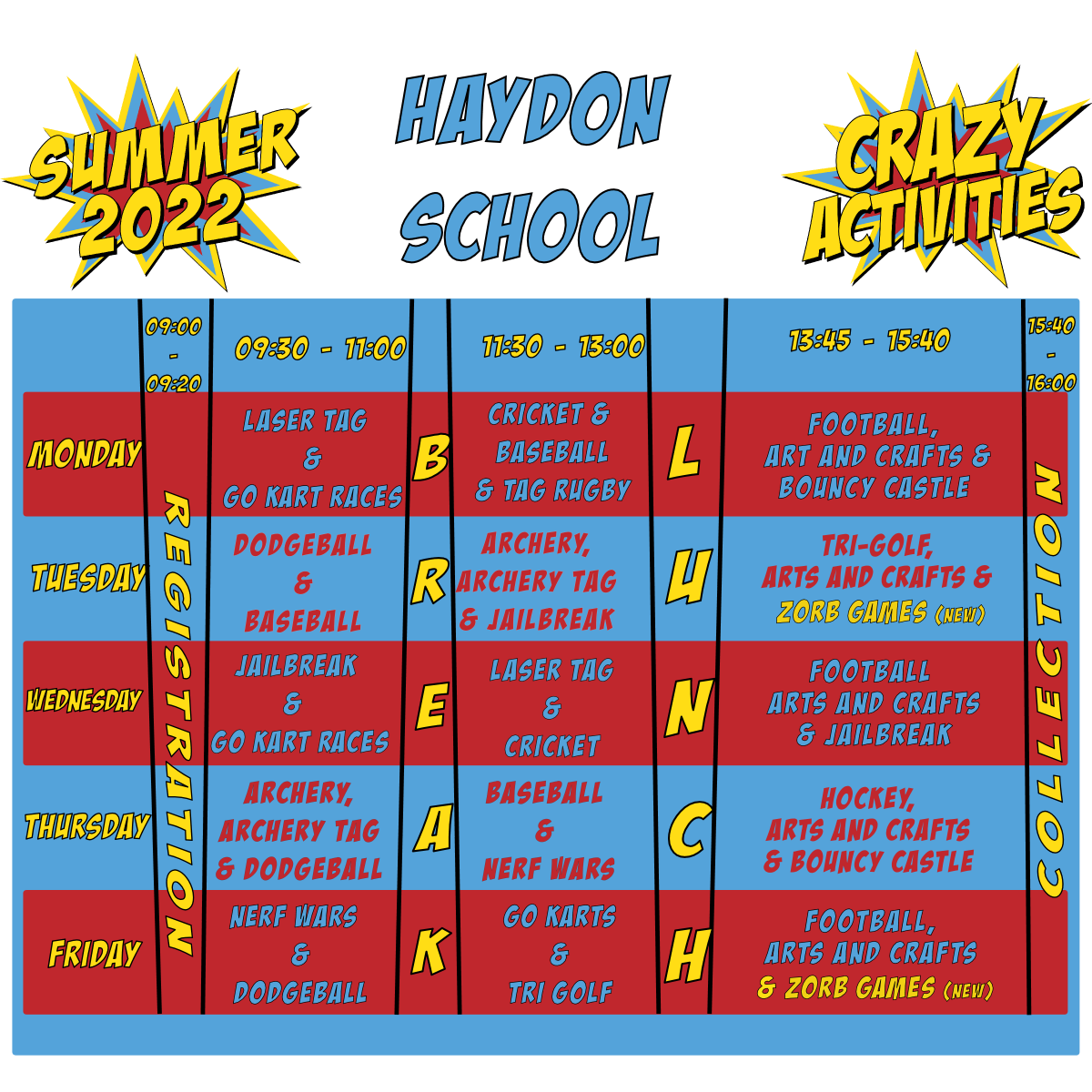 Crazy Camps Club (Year 1 to Year 7 groups): Drop off is between 09:00 and 09:20 and collection between 15:40 and 16:00. No pets on the premises please.