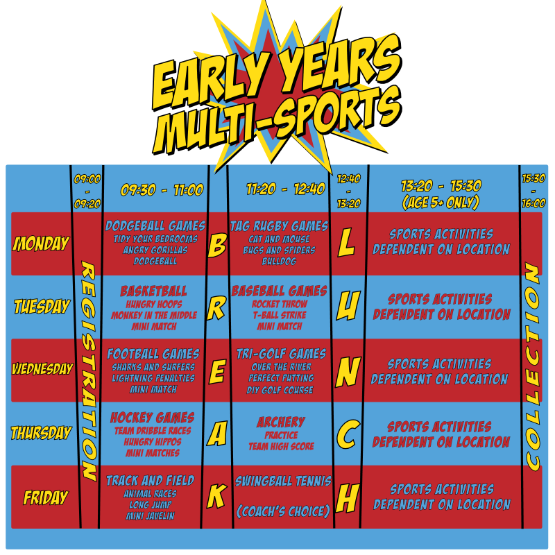 Early Years (age 4 and 5 year olds in Reception class) join our Multi-Sports club - see the timetable below. Age 4 can attend for a half day only and age 5 can attend a half or a full day.